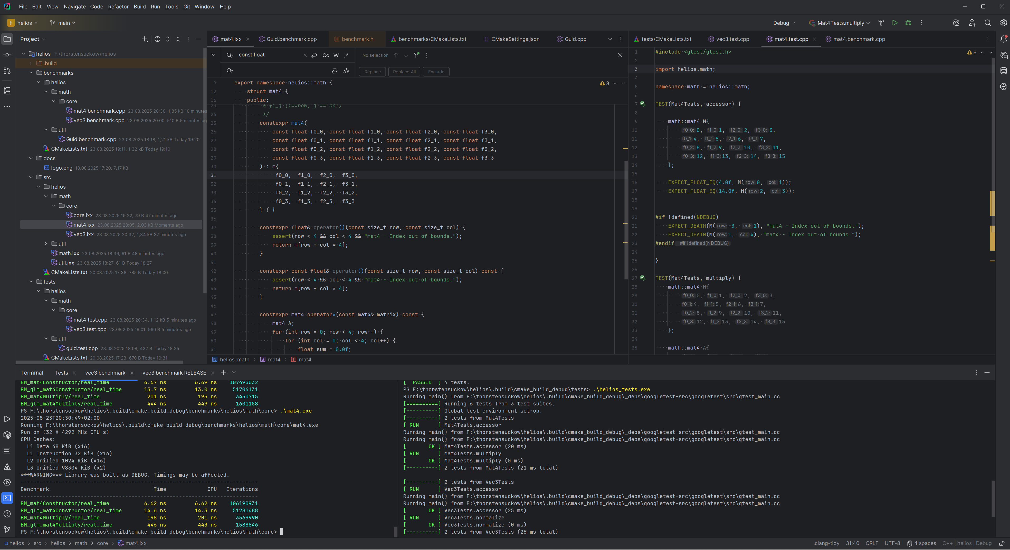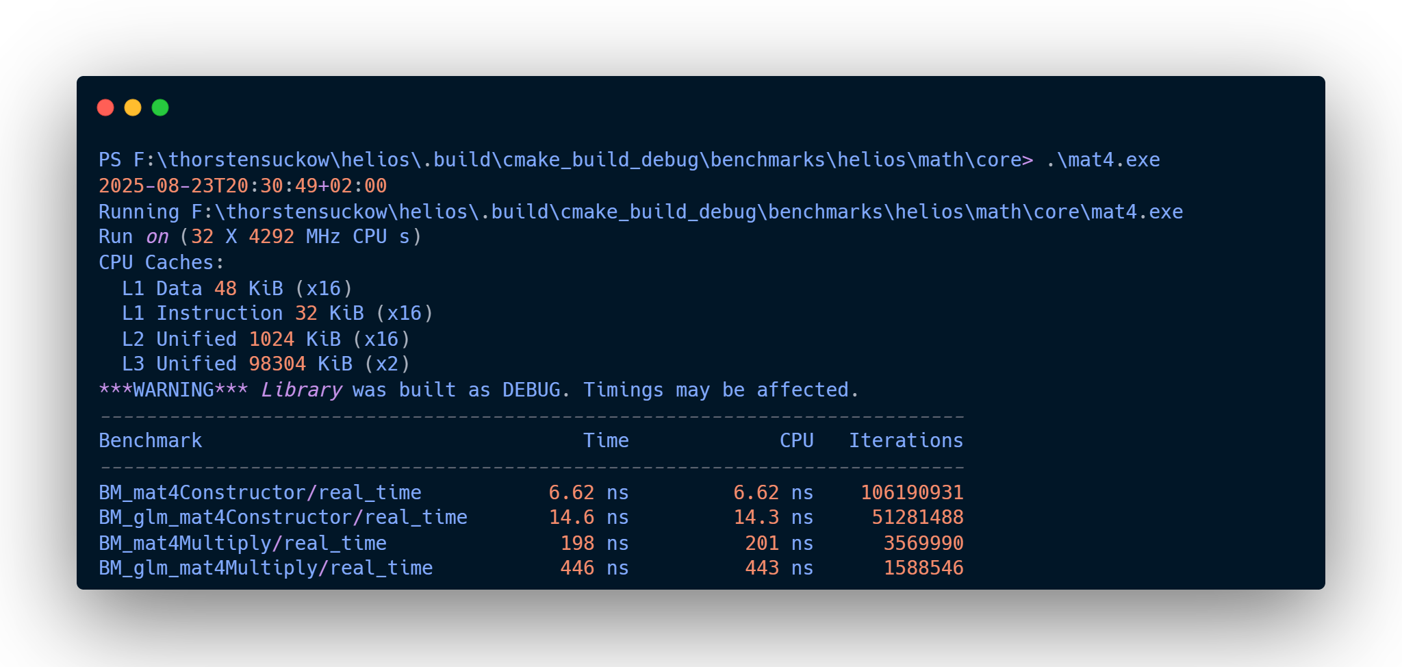 In both constructor and multiplication tests, the helios implementation shows a promising performance. Of course I’m nowhere close to the optimizations of glm which sports much, much more functionality than my basic implementations, but its nonetheless nice to see how the two compare.